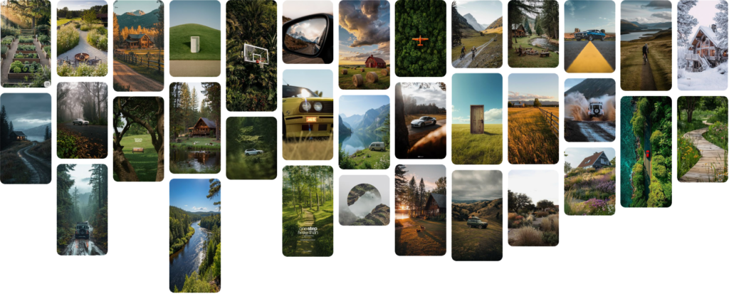 In images 1-4 they all use the idea of geometric reflections where we can see a frame of the image has been duplicated, flipped and then framed in a certain shape. These are amazing and are an awesome way to highlight a certain aspect of a scape. In image 4 in particular we can see that a gradient neutral density filter has probably been used to give the sky a gradient, or possibly masking has been used in editing to add a gradient to a exposure mask. But this gradient is made very obvious by the overlapping image where the sky has been flipped too and that can be seen as the gradient contrasts slightly with the image next to it, highlighting the chosen shape. Image 3 I really like as the shape is unique and slightly different and helps show the idea of the trees being on a hill maybe, as we can see the distance from tops of the trees from the contour line is pretty consistent. The sky being so white makes such a contrast between the flipped trees and the sky, but this is because of the chosen time where their was lots of atmosphere in the air from dropped clouds. Again something similar can be said for image 2, where the use of the circle shape follows the contour of the land where the land seems to almost cave in, however this time it looks like a different image from the main one and it seems that the artist has matched them together as their shapes “fit” together. The atmosphere is gloomy here, most likely from the weather where it looks like in the distance it is heavily raining which can be seen from the dramatic sky on the top left of the image.