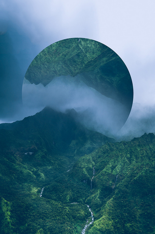 Victoria, otherwise known as Witchoria is a Brooklyn-based American graphic artist who focuses mainly on photograph manipulation in Adobe Photoshop. She mainly does fractured landscapes, where she makes a frame of a landscape over a landscape using a geometric shape, such as a circle or rectangle. From her website: “She works predominantly in the digital realm, creating surreal photo manipulations that reflect her penchant for ennui, existential crisis, and heartbreak.”